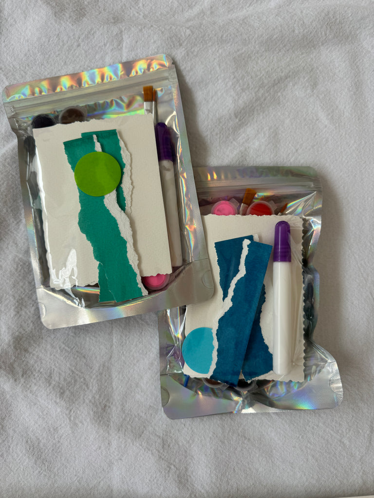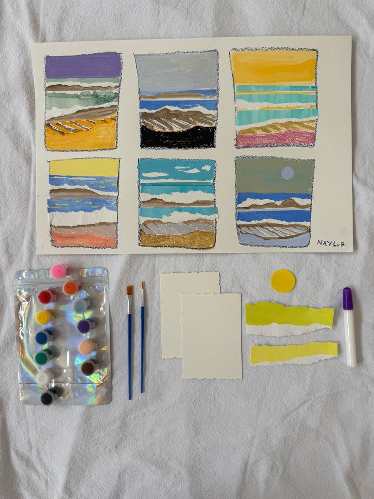 Everything you need to make your own paper seat collage at home! Includes pre-painted and torn paper, Two watercolor pieces- One for sketching and one for doing your collage, A set of paints, paint brushes, and of course glue! Perfect for winter blues or for summer cottage trips!