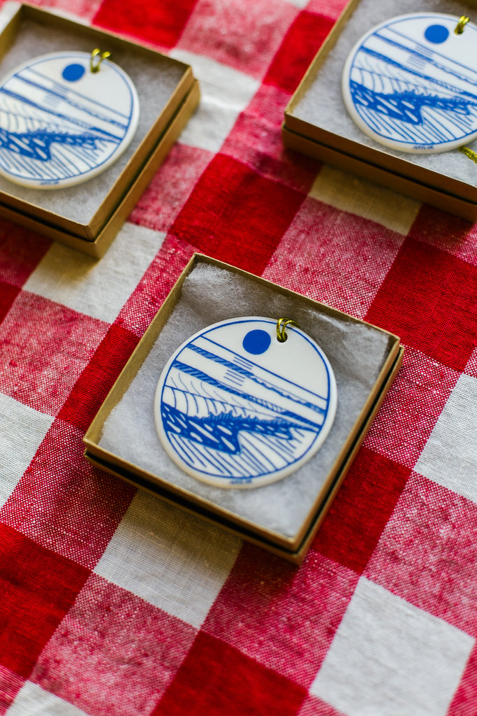 This is from my 2025 Holiday Ornament Collection. Each porcelain ornament is hand-drawn by Andrea Naylor then screen-printed on flat porcelain and signed. Each Ornament measures 3 inches in diameter. It comes with a gold thread for hanging and custom box for safely storing in your Christmas decorations year after year.